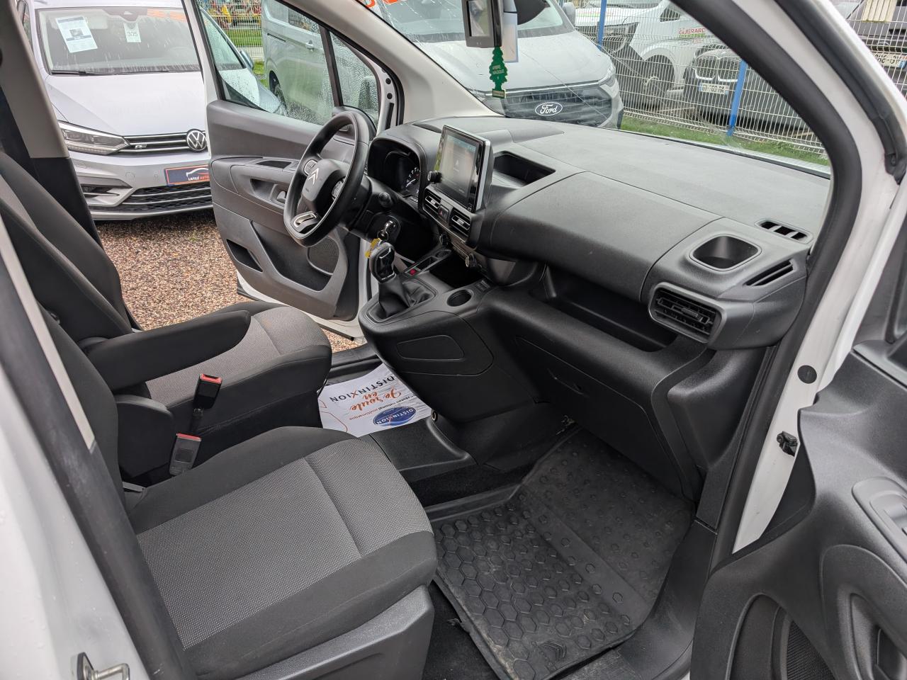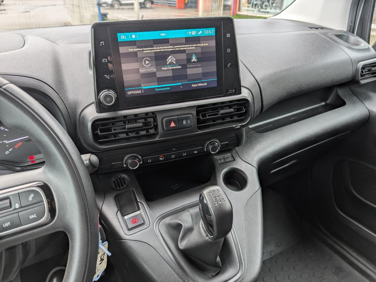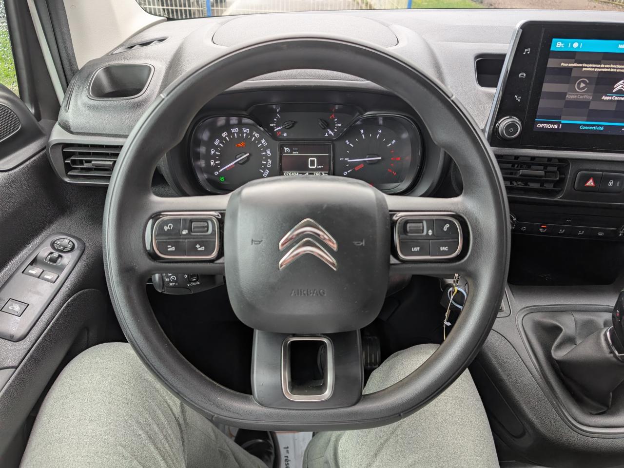 6 anneaux d'arrimage en zone de chargementABS avec répartiteur électronique de freinage (REF) et aide au freinage d'urgence (AFU)Aide au démarrage en côteAide au stationnement arrièreAirbag frontal conducteurAllumage automatique des projecteursBac de porte avantBaguettes de protection latérales noires teintées masseBoîte à gants supérieure Top Box fermée (réfrigérée si climatisation)Bouchon / trappe à carburant verrouillablesCapucine transversale de rangement ouverteCITROËN Connect Box avec Pack SOS et assistance inclusClimatisation manuelleCloison pleine fixe (avec crochet porte-habit)Commande du système audio au volantCondamnation centralisée avec plip 3 boutonsContrôle dynamique de conduite (ESP) avec fonction anti-patinage (ASR)Coques de rétroviseurs noires teintées masseDétection de sous-gonflage indirecteEclairage d'accueil et d'accompagnementEssuie-vitre avant avec système de lavage 'Magic Wash'Frein de stationnement électriqueJantes tôle 15'' grises avec cabochonKit mains libres Bluetooth et prise USBLève-vitres avant électriquesOrdinateur de bordPare-chocs avant et arrière noirs teintés massePeinture opaque Blanc BanquisePneumatiques 195/65 R15Poignées de portes extérieures noires teintées massePorte latérale droite coulissante tôléePortes arrières battantes tôlées 60/40 avec ouverture à 180°Prise 12 V sur planche de bordProjecteurs antibrouillardRégulateur et limiteur de vitesseRétroviseurs extérieurs réglables électriquement et dégivrantsRails de PLC avec enjoliveurs noirs teintés masseRangement fermé derrière le combinéRevêtement de sol en TPO dans l'habitacleRoue de secours homogèneSellerie tissu Mica GreySiège conducteur confort avec réglage en hauteur, réglage lombaire, rangement sous siège et accoudoirSiège passager individuel réglable en inclinaison et en longueurSystème audio MP3 (2 HP + 2 tweeters) avec commandes sous volantVolant mousséVolant réglable en hauteur et en profondeurZone de dépose pour smartphone