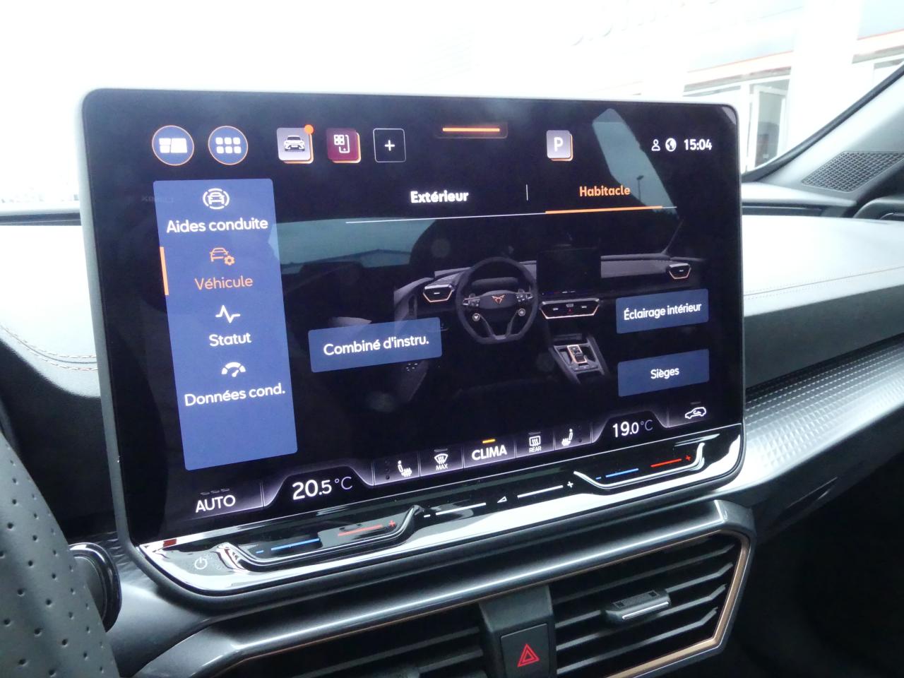 6 haut-parleursAccès et démarrage mains-libresAccoudoir central avantAccoudoir central réglable en profondeur et en hauteurAide au stationnement avant/arrièreAirbag central avantAirbags latéraux et rideauxAppel d'urgence - EcallBandeau arrière "Infinite Light" intégrant le logo CUPRA lumineux, avec signature lumineuse Tri-LED et cérémonie de bienvenueBanquette arrière rabattable 2/3 - 1/3 avec trappe à skisBas de caisses couleur contrastante Noir ObsidienBluetoothCaméra de reculCiel de pavillon noirClimatisation automatique Climatronic tri-zoneConnectivité 4x USB-CConnectivity Box avec chargeur à inductionContrôle vocalCoque de rétroviseurs peinte dans le ton contrasté noir obsidienneCUPRA BoxDesign Intérieur PureDétecteur de pluie et allumage automatique des projecteursDiffuseur couleur contrastante Noir ObsidienDigital Cockpit : combiné d’instruments digital haute résolution couleur de 10,25"Direction dynamiqueDouble-sortie d'échappement noire styliséeEclairage d'ambiance intérieur intelligentEclairage de bienvenue avec projection du logo CUPRA au solElargisseurs d'ailes couleur contrastante Noir ObsidienEntrées d'air AV couleur contrastante Noir ObsidienFixations Isofix et Toptether aux sièges arrièreFront Assist avec détection des piétons et des cyclistesFull Link sans fil (Android Auto + Apple CarPlay)Hayon électrique + fonction Virtual PedalJantes alliage 18'' TempestKit de sécurité CupraLampe de lecture avant et arrière à LEDLane Assistant : assistant de maintien dans la voieLight Assist : Activation ou désactivation automatique des feux de routePack intérieur Dark Alu avec inserts cuivrésPalettes de changement de rapportsPare-soleil avant avec miroirs de courtoisie éclairésPeinture Bleu FjordProjecteurs anti-brouillard triangulaires avec éclairage d'intersection et éclairage d'accompagnementProjecteurs Full LED avec signature Tri-LEDRadio Numérique DABRails de toit et entourage de vitres Noir PianoRégulateur de vitesse adaptatifRétroviseur intérieur électrochromeSeuils de porte CUPRA rétro-éclairésSign Assist (reconnaissance des panneaux de signalisation)Système d'info-divertissement avec écran tactile HD 12,9" et touches de commandes tactiles rétro-éclairéesSystème de détection de la somnolence du conducteurVitres arrière surteintéesVolant Supersports Cupra avec boutons satellitesVolant Supersports CUPRA chauffant en cuir