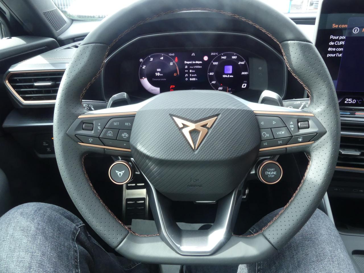 6 haut-parleursAccès et démarrage mains-libresAccoudoir central avantAccoudoir central réglable en profondeur et en hauteurAide au stationnement avant/arrièreAirbag central avantAirbags latéraux et rideauxAppel d'urgence - EcallBandeau arrière "Infinite Light" intégrant le logo CUPRA lumineux, avec signature lumineuse Tri-LED et cérémonie de bienvenueBanquette arrière rabattable 2/3 - 1/3 avec trappe à skisBas de caisses couleur contrastante Noir ObsidienBluetoothCaméra de reculCiel de pavillon noirClimatisation automatique Climatronic tri-zoneConnectivité 4x USB-CConnectivity Box avec chargeur à inductionContrôle vocalCoque de rétroviseurs peinte dans le ton contrasté noir obsidienneCUPRA BoxCUPRA ConnectDétecteur de pluie et allumage automatique des projecteursDiffuseur couleur contrastante Noir ObsidienDigital Cockpit : combiné d’instruments digital haute résolution couleur de 10,25"Direction dynamiqueDouble-sortie d'échappement noire styliséeEclairage d'ambiance intérieur intelligentEclairage de bienvenue avec projection du logo CUPRA au solElargisseurs d'ailes couleur contrastante Noir ObsidienEntrées d'air AV couleur contrastante Noir ObsidienFixations Isofix et Toptether aux sièges arrièreFront Assist avec détection des piétons et des cyclistesFull Link sans fil (Android Auto + Apple CarPlay)Hayon électrique + fonction Virtual PedalJantes alliage 18'' TempestKit de sécurité CupraLampe de lecture avant et arrière à LEDLane Assistant : assistant de maintien dans la voieLight Assist : Activation ou désactivation automatique des feux de routePack intérieur Dark Alu avec inserts cuivrésPalettes de changement de rapportsPare-soleil avant avec miroirs de courtoisie éclairésProjecteurs anti-brouillard triangulaires avec éclairage d'intersection et éclairage d'accompagnementProjecteurs Full LED avec signature Tri-LEDRadio Numérique DABRails de toit et entourage de vitres Noir PianoRégulateur de vitesse adaptatifRétroviseur intérieur électrochromeSeuils de porte CUPRA rétro-éclairésSign Assist (reconnaissance des panneaux de signalisation)Système d'info-divertissement avec écran tactile HD 12,9" et touches de commandes tactiles rétro-éclairéesSystème de détection de la somnolence du conducteurTapis de sol CUPRA coordonnés à la sellerieVitres arrière surteintéesVolant Supersports Cupra avec boutons satellitesVolant Supersports CUPRA chauffant en cuir