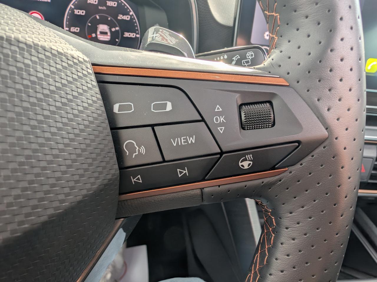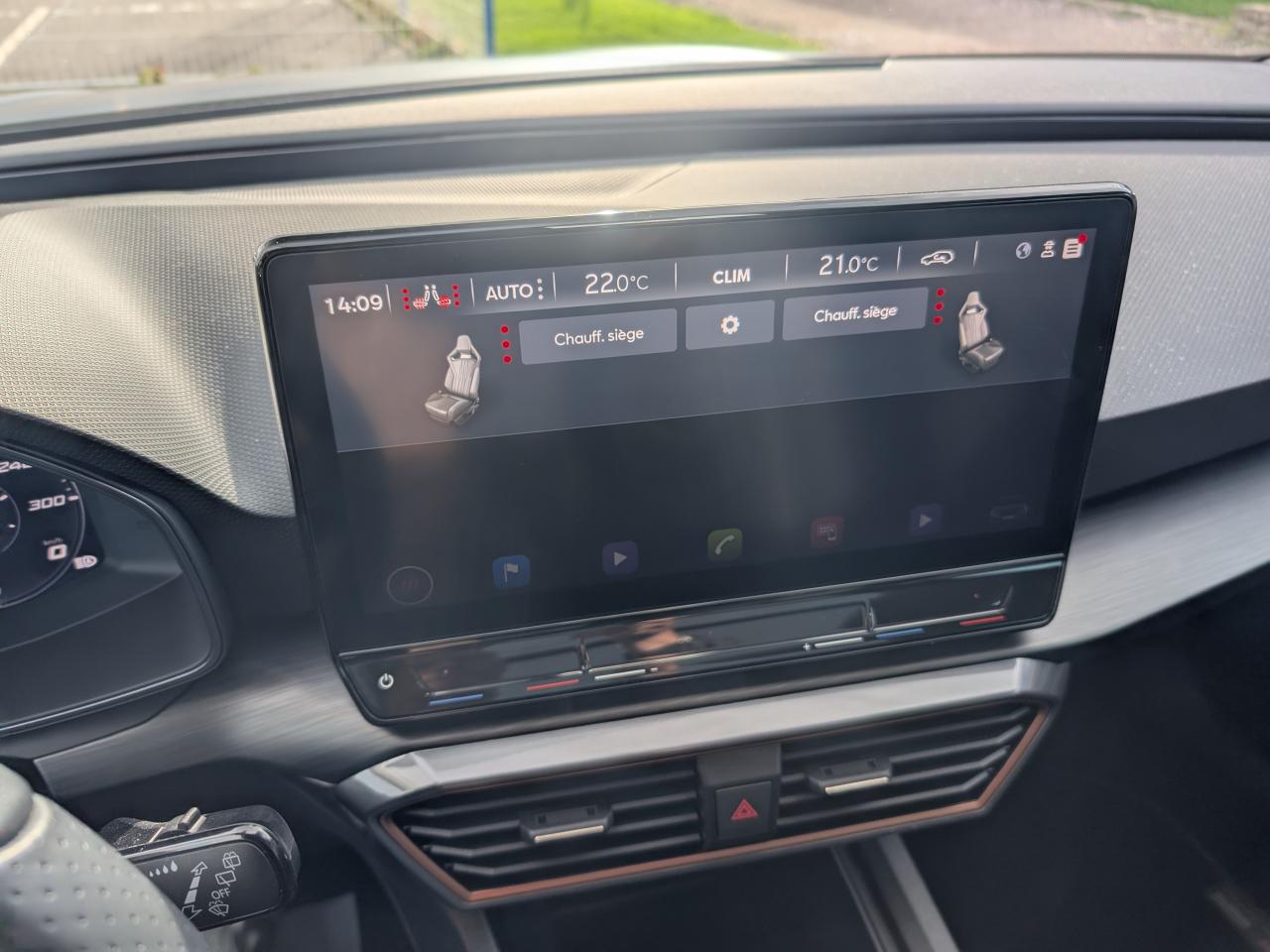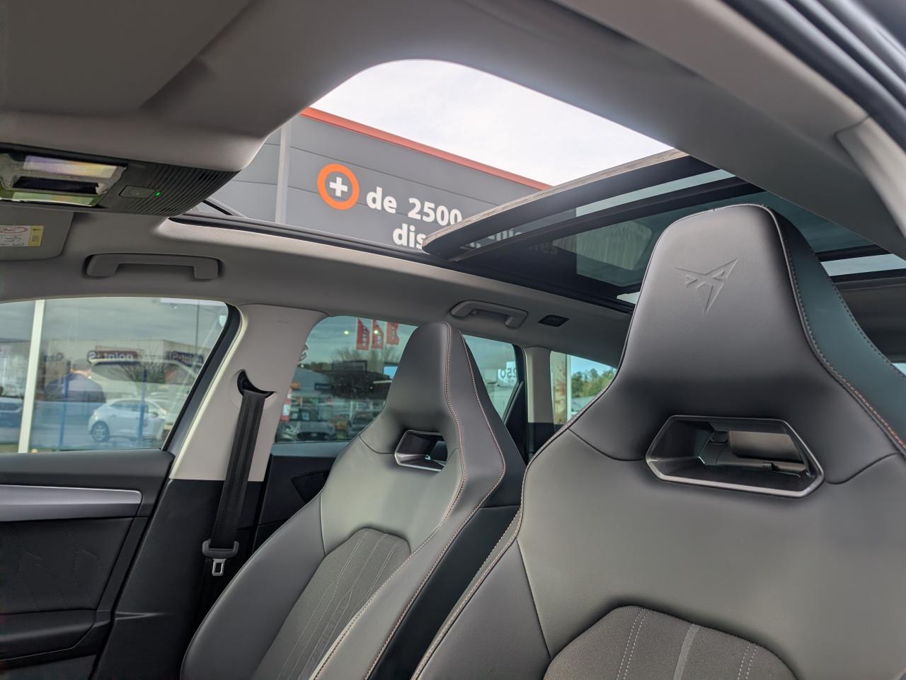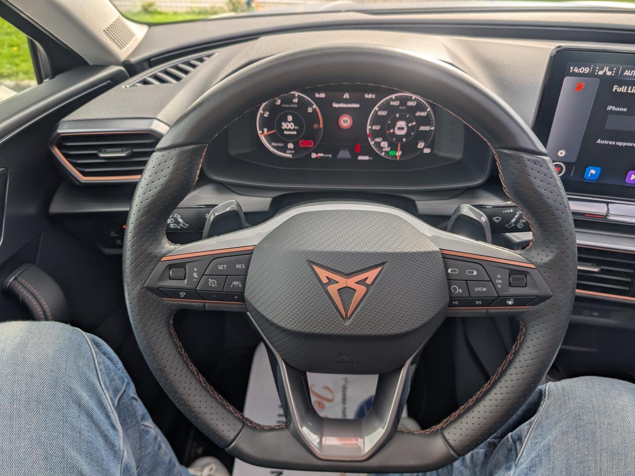 4 prises USB-C éclairées6 haut-parleursAccès et démarrage mains-libresAccoudoir central avantAide au stationnement avant/arrièreAirbag central avantAirbags latéraux et rideauxAppel d'urgence - EcallBandeau arrière "Infinite Light" intégrant le logo CUPRA lumineux, avec signature lumineuse Tri-LED et cérémonie de bienvenueBluetoothCaméra de reculCiel de pavillon noirClimatisation automatique Climatronic tri-zoneConnectivity Box avec chargeur à inductionContrôle vocalCUPRA Box (bracelet et coque de clé en fibre de carbone)CUPRA ConnectDesign Intérieur PureDétecteur de pluie et allumage automatique des projecteursDigital Cockpit : combiné d’instruments digital haute résolution couleur de 10,25"Direction dynamiqueDossiers de banquette AR rabattables 2/3 1/3Double-sortie d'échappement noire styliséeEclairage d'ambiance intérieur intelligentEclairage de bienvenue avec projection du logo CUPRA au solFixations Isofix et Toptether aux sièges arrièreFonction 'Coming Home'Front Assist avec détection des piétons et des cyclistesFull Link sans fil (Android Auto + Apple CarPlay)Hayon électrique + fonction Virtual PedalJantes alliage 18'' Performance usinéesLampes de lecture AV et ARLane Assistant : assistant de maintien dans la voieLight Assist : Activation ou désactivation automatique des feux de routePalettes de changement de rapportsPare-soleil avant avec miroirs de courtoisie éclairésProjecteurs antibrouillard avec éclairage d'intersectionProjecteurs Full LED avec signature Tri-LEDRadio Numérique DABRails de toit Noir GlossyRégulateur de vitesse adaptatifRétroviseur intérieur électrochromeSeuils de porte CUPRA rétro-éclairésSystème d'info-divertissement avec écran tactile HD 12,9" et touches de commandes tactiles rétro-éclairéesSystème de détection de la somnolence du conducteurSystème de reconnaissance des panneaux de signalisation TSR (Traffic Sign recognition)Tapis de sol en matière recyclée avec surpiqûres cuivrées CUPRAVitres arrière surteintéesVolant Supersports Cupra avec boutons satellitesVolant Supersports CUPRA chauffant en cuir