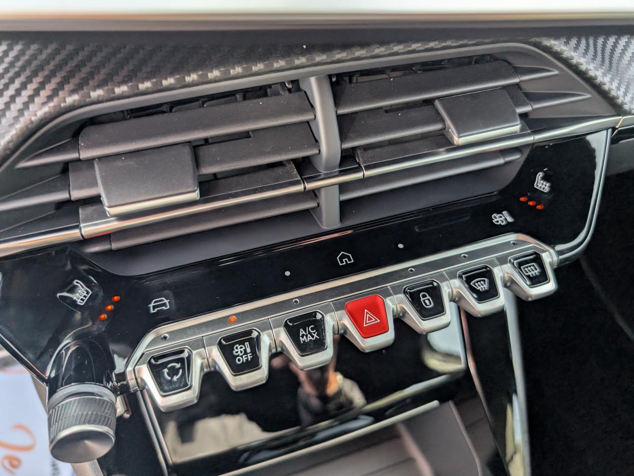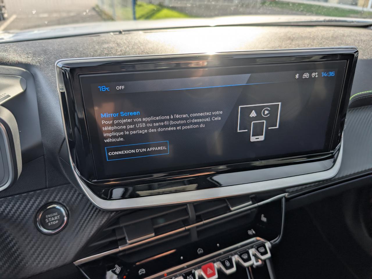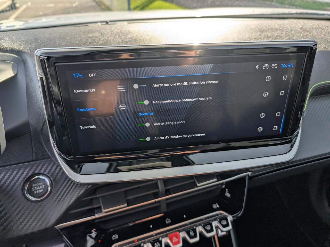 1 prise USB type C (Charge) et 1 prise USB type A (Charge) pour passagers arrière4 poignées de maintien (2 à l'avant et 2 à l'arrière)6 haut-parleurs (2 tweeters et 2 woofers à l'avant et 2 haut-parleurs à l'arrière)Accès et démarrage mains libres ProximityAccoudoirs de porte avant et arrière tissu/TEP Isabella avec surpiqûre AdamiteAide au démarrage en côteAir conditionné automatique Mono-zoneAirbags frontaux auto-adaptatifs, latéraux avant (thorax et abdominaux), rideaux avant et arrièreAppuie-tête avant et arrière (aux 3 places) réglables en hauteurBanquette arrière rabattable 1/3-2/3Barres de toit longitudinales noires brillantesBecquet arrière Noir Perla NeraBoitiers de rétroviseurs extérieurs noir brillantCalandre Haut de gamme Noir avec marquage vertical couleur caisse, larmes Dark ChromeCanule d'échappement chromée doubleCommandes d'ouverture extérieure de portes couleur caisseConsole haute avec accoudoir & frein de stationnement électriqueDécor de grille inférieure Gris MétéorDétection de sous-gonflage indirecteEclairage coffreEclairage polyambiant 8 couleurs (Liés aux modes de conduite)Enjoliveur de seuil de coffre Gris MétéorEnjoliveur supérieur couleur caisseEnjoliveurs de custode NoirESP entièrement déconnectableFeux arrière 3 griffes à LEDFixations ISOFIX Top Tether pour les places latérales arrièreHabitacle et ciel de pavillon noirJantes alliage 17'' diamantées KARAKOY bi-ton Noir Orbital vernis brillantKatana noir mat avec insert noir brillant et monogramme GTLécheurs de vitres latérales noir brillantLécheurs de vitres latérales Noir MatLève-vitres électriques avant et arrière, séquentiels et antipincementPack Eclairage IntérieurPack Eclairage IntérieurPack i-ConnectPack Safety PlusPack VisibilitéPanneaux de portes arrière avec grain Karsten avec baguette Noir brillantPanneaux de portes avant avec décor Carbone et baguette Noir brillante et jonc lumineux (8 couleurs) et crosse de tirage TEP Isabella MistralPare-brise teinté acoustique sérigraphié bi-couchesPédalier sport en aluminiumPEUGEOT Connect SOS & Assistance et TéléservicesPeugeot i-Cockpit 3D avec combiné tête haute 10" numériquePlanche de bord moussée avec double surpiqûres adamite/tramontane et baguette Noir brillante avec jonc chromé et jonc lumineuxPlancher de coffre modulable 2 positionsPoignées de maintien rétractables (x 4)Projecteurs Peugeot upper Full LED Technology avec feux diurnes à LED 3 griffesProtections latérales de porte noir grainé avec inserts Gris MétéorRétroviseur intérieur électrochromeRétroviseurs extérieurs chauffants et rabattables électriquementRétroviseurs extérieurs réglables électriquementSélecteur de mode de conduite (ECO / NORMAL / SPORT)Seuils de porte aluminium avec lettrage PEUGEOT NoirSiège conducteur avec réglage manuel en hauteurSiège passager avant réglable en hauteur manuellementSurtapis aux places avant et arrièreSystème de commutation automatique feux de route/feux de croisementToit Black DiamondVisio Park 1Vitres latérales arrière et lunette arrière chauffante temporisée surteintéesVolant compact cuir fleur, commandes multimédia intégrées