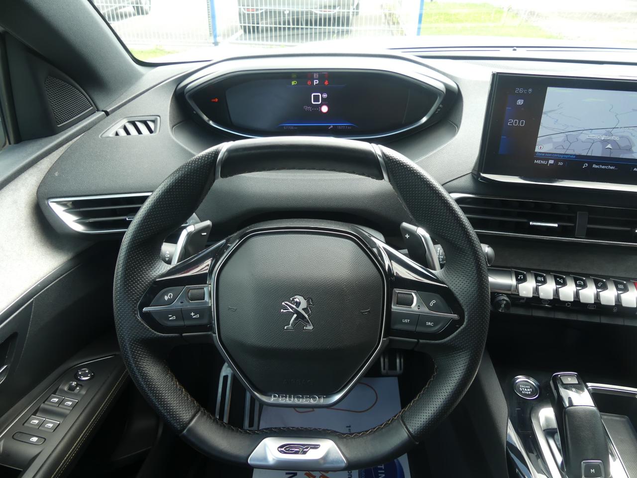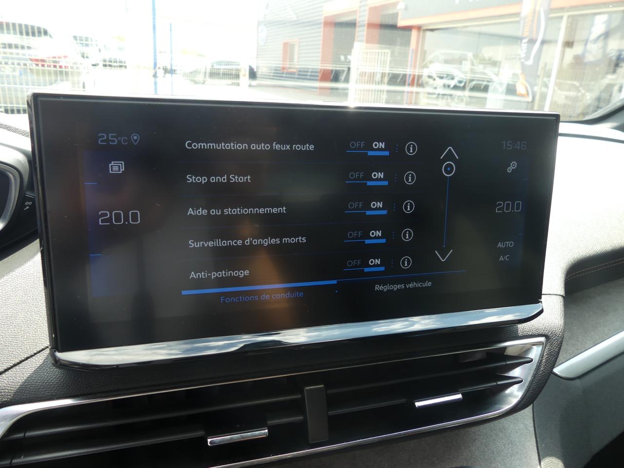 ABS avec répartiteur électronique de freinage (REF) et aide au freinage d'urgence (AFU)Accoudoir central avant à ouverture papillon, avec compartiment de rangement éclairé et réfrigérableAide graphique et sonore au stationnement arrièreAir conditionné automatique bi-zone avec aérateurs aux places arrièreAirbags frontaux conducteur et passager adaptatifs (airbag passager déconnectable)Airbags latéraux conducteur et passager avantAirbags rideaux de tête aux places avant et arrièreAppuis-tête à sécurité optimisée réglables en hauteur sur les sièges conducteur et passager avant ainsi que sur les places latérales arrièresAvertisseur de temps de conduiteBandeau de pare-choc arrière chroméBanquette rabattable 1/3 - 2/3 (commandes dans le coffre) avec accoudoir et trappe à skisBarres de toit longitudinales profilées en aluminiumBoîte à gants floquée et éclairéeCalandre GT avec design évolutif chroméCanules d'échappement de style chroméesCarte d'accès et démarrage mains libresCommande de verrouillage à distance (deux plips)Commandes de lève-vitres avec inserts chromésContrôle dynamique de stabilité CDS avec antipatinage électronique ASRCoques de rétroviseurs extérieurs Noir Perla NeraDécors de planche de bord et panneaux de portes en Alcantara Gris GrevalDécors intérieurs (baguettes de planche de bord et panneaux de portes, enjoliveur de console) chromésDétection de sous-gonflage indirecteDirection assistée électrique, avec colonne de direction réglable en hauteur et profondeur (mécanique)Drive Mode : Choix de 2 modes de conduite (Eco ou Sport)Enjoliveurs d'arc de pavillon en inoxEnjoliveurs en inox sur les protecteurs de bas de portesEssuie-vitre arrière à activation automatique au passage en marche arrièreEssuie-vitre avant avec système de lavage 'Magic Wash'Fixations pour trois sièges enfants suivant norme ISOFIX aux places passager avant et latérales arrièreFonction 'Mirror Screen' (Apple Carplay / Android Auto)Frein de stationnement électrique avec aide au démarrage en penteHabitacle et ciel de pavillon Noir MistralIndicateur de rapport conseilléInserts d'ailes avant chromésJantes alliage 18" 'Detroit' bi-ton diamantées Noir OnyxJoncs de vitres latérales en inoxKit de dépannage pneumatiqueLève-vitres électriques avant et arrière, séquentiels et antipincementLimiteur de vitesseLunette arrière chauffante avec antennes sérigraphiéesMiroirs de courtoisie éclairésNavigation 3D connectée avec reconnaissance vocale, écran tactile capacitif 10" HDPack City 1 (Aide graphique et sonore au stationnement avant Visiopark 1 : caméra de recul avec restitution sur l'écran tactile d'une vue arrière, et d'une vue de dessus de l'environnement arrière du véhicule)Pack Drive Assist Plus (Aide au maintien dans la file (LKA) Régulateur de vitesse adaptatif avec fonction Stop & Go)Pack Eclairage d'ambiancePack Safety Plus (Alerte active de franchissement involontaire de ligne et bas côté Alerte attention conducteur Commutation automatique des feux de route Pack Safety Système de surveillance d'angle mort)Pack Visibilité (Allumage automatique des feux de croisement Eclairage d'accompagnement automatique Essuie-vitre avant automatique et rétroviseur intérieur photosensible)Passages de roues rapportés noirsPédalier et repose-pied conducteur en aluminiumPEUGEOT Connect SOS & Assistance et TeleservicesPeugeot i-Cockpit : combiné tête haute numérique haute qualité d'affichage, écran tactile capacitif 10" HD et volant compact multi-fonctionsPlafonnier avec spots de lecture avant (x2) et arrière (x2)Planche de bord surpiquéePoches aumônières au dos des sièges avantPrise USB (dans la zone connectique)Prises 12V (x3 : zone connectique, arrière de console et coffre)Prises USB de charge (x2) au 2nd rangProjecteurs 'Peugeot Full LED Technology' avec correction automatique de site, fonction Eclairage Virage Statique,'Foggy Mode' et feux diurnes à LED prolongés dans les projecteursReconnaissance étendue des panneaux de signalisation et préconisation de vitesseRétroviseur intérieur à position nuit automatique, sans encadrementRétroviseurs extérieurs électriques et dégivrants, rabattables électriquement avec éclairage d'accueil à LEDSabot de pare-choc avant gris métalliséSécurité enfant électrique des vitres arrièreSellerie Mi-TEP/Tissu BelomkaSeuils de portes avant en inoxSiège conducteur avec réglage lombaireSiège conducteur et passager réglables en hauteurSiège passager avant avec mise en tabletteSurtapis avant/arrièreToggle Switches' chromés (touches 'piano' d'activation des fonctions de l'écran tactile)Toit 'Black Diamond' (toit Noir Perla Nera)Verrouillage automatique de tous les ouvrants en roulantVitres latérales et lunette arrière surteintéesVolant cuir fleur perforé avec bagues chrome acier et badge GT